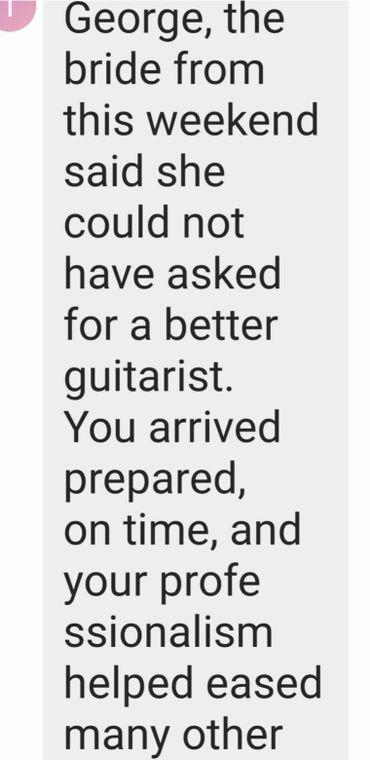 With Covid our daughters wedding was turned upside down. After having to change the venues we got lucky and found George and his guitar. We texted/emailed back and forth, hashed out the details and I didn't have to worry about a thing. He was professional, prompt and the assortment of music he played, was just beautiful. George if you see this- our daughter thought it was perfect, better than the original wedding plans. Thanks for making her day truly special and unique. Continued success to you!