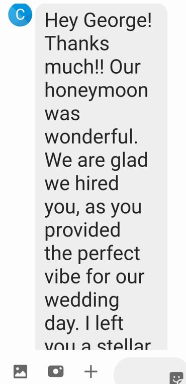 George was phenomenal to work with! He was really responsive and professional in all communications, and the day of our wedding. I was most impressed by him offering to learn a few songs to play during our ceremony! I can’t recommend him and his services enough. 😊