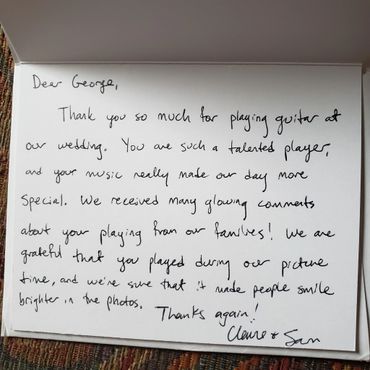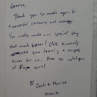 Paul and I wanted to say thank you. We are sorry we did not get a chance to thank you on Monday before you had to pack up. We are so glad we were able to connect with you when looking for a musician. We really appreciate the time you took to learn our songs and travel to our location. The music you provided was perfect for our intimate ceremony.