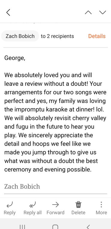 George was wonderful, from the first moment of contact until he was done performing on our special day. I come from a family of musicians and grew up with music being a huge part of everyday life. As critical as we can be, every one of my family members and so many friends commented on how great George sounded. We asked for several songs that George specifically learned and arranged to play during our ceremony, and he did an amazing job! We highly recommend him and couldn't have been happier. Thank you so much George:)
